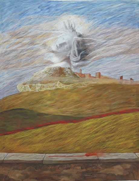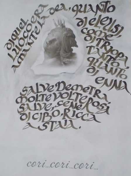 In basso il paesaggio che osservo tutti i giorni : il lago di Pergusa da un lato, Enna sull’altro e l’Etna maestosa come sfondo, la tela si chiude con l'invocazione Cori...Cori...Cori... invocazione di sgomento di Kore quando vagava in cerca della figlia e che gli ennesi, tutt'oggi, nel dialetto locale, la utilizzano comunemente.”