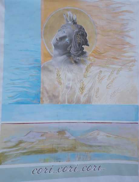In basso il paesaggio che osservo tutti i giorni : il lago di Pergusa da un lato, Enna sull’altro e l’Etna maestosa come sfondo, la tela si chiude con l'invocazione Cori...Cori...Cori... invocazione di sgomento di Kore quando vagava in cerca della figlia e che gli ennesi, tutt'oggi, nel dialetto locale, la utilizzano comunemente.”