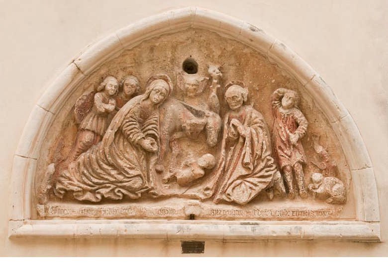 Nella parete esterna, a sinistra della chiesa, è incassata la Lunetta di Berlon, un bassorilievo con Natività risalente alla fine del Trecento, appartenente al prospetto della precedente chiesetta di Santa Maria di Betlem, sita nello stesso luogo.