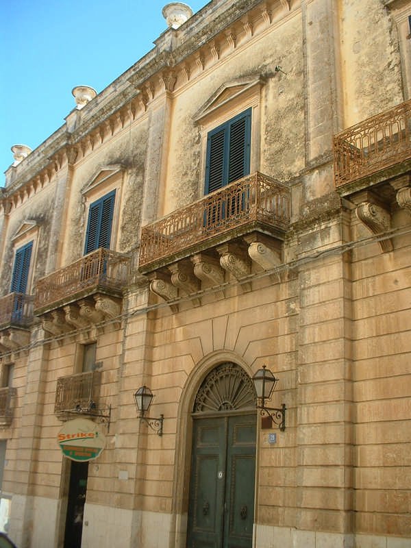 Il prospetto dell’edificio presenta un elegante portone arcuato con altre porte rettangolari ai lati, mentre i balconcini superiori sono arricchiti da inferriate in ferro battuto e le aperture sono sormontate da timpani triangolari.